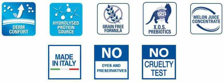 המזון היבש מבוסס על חלבון סלמון נורווגי שעבר הידרוליזה, בעל משקל מולקולרי נמוך במיוחד, מזון החתולים מכיל בנוסף עוף, המזון הרטוב מבוסס על חלבון יחיד מן מהחי – חזיר מכיל שמן סלמון טהור – מקור עשיר לאומגה 3 בעלת פעילות אנטי דלקתית, אנטי חמצונית.